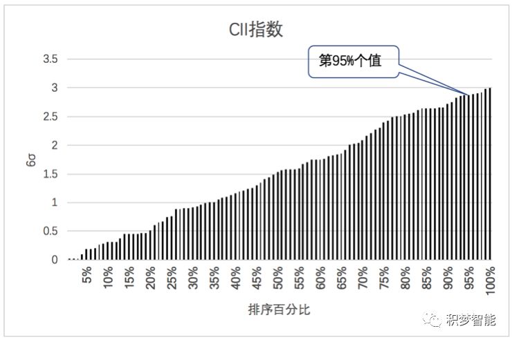 b、以全部测点的第95%个点的波动值6σ为标准画出一条分界线,取该波动值作为车身某段时间内的的CII(不断改进)值来评价其稳定性,CII值越小,则整车稳定性越好