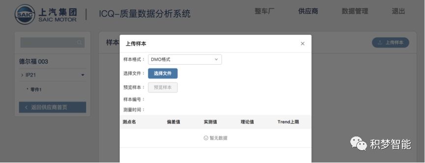 供应商数据也是影响产品最终质量的关键因素,以往供应商数据都是零散提供,不能做有效地统计分析,并且对供应商数据的正确性也不能有效把控。如今各个供应商通过网络直接将数据上传到数据分析平台中,上汽可以对这些数据做长期的追溯分析。并且设置统计算法,当供应商数据造假或有手动修改,系统会产生提示信息或拒绝数据上传。利用这一功能,SQE能更加有效地管理供应商质量。