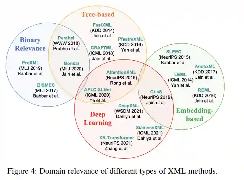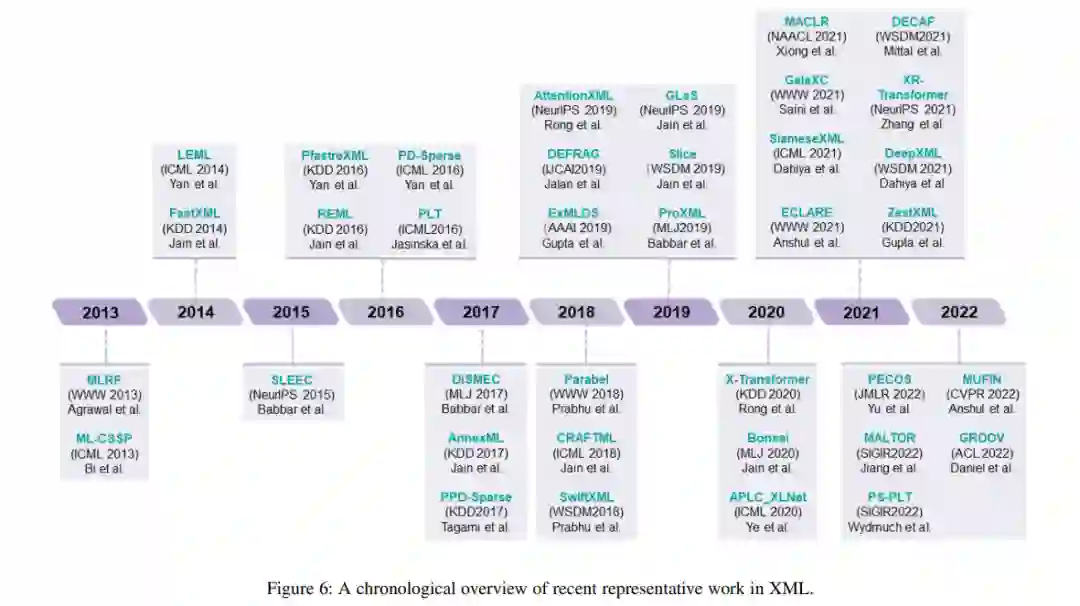据我们所知,这是第一次与XML相关的先驱综述。本次调研的贡献可以概括为:1)综合综述。我们将全面回顾XML,包括核心挑战及其相应的解决方案。2)新分类法。我们提出了一种XML分类法,它从三个不同的角度对现有的XML方法进行了分类:1)模型体系结构; 2) 尾标签学习; 3) 弱监督XML。3) 资源丰富。我们收集了大量关于XML的资源,包括XML方法的开源实现、数据集、工具和纸列表。4)未来的发展方向。我们讨论并分析了现有XML方法的局限性。并提出了未来可能的研究方向。