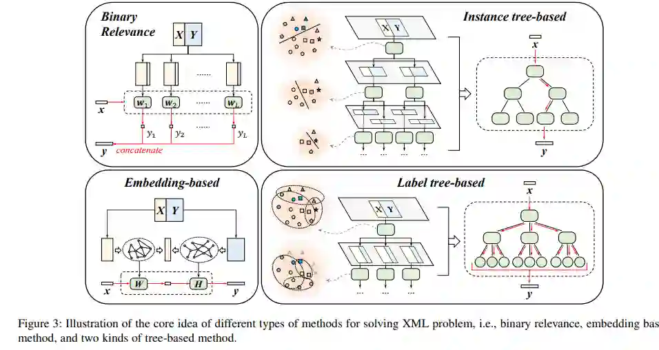 算法开发一直是机器学习研究的核心问题,XML也不例外。在过去的十年中,人们提出了大量的算法来从超限多标记数据中学习。根据每种算法的特性和XML的关键挑战,我们提出了一种新的XML分类法,即:1)模型体系结构;2)尾标签学习;3)弱监督。考虑到在有限的篇幅内浏览所有现有的算法是不可能的,在这篇综述中,我们选择仔细调研每个研究方向的代表XML算法。根据解决XML问题的角度,大多数方法可以分为三个分支:二进制关联法、基于嵌入的方法和基于树的方法。我们在图2中提供了一个说明。