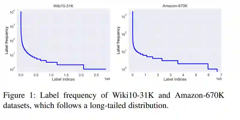 超限多标签学习(Extreme Multi-label Learning, XML)旨在从大量的候选标签中标注出具有相关标签的对象。近年来,XML在推荐系统、搜索引擎等领域得到了广泛的应用。特别是,图1展示了Wikipedia和Amazon的两个真实的XML数据集,它们具有大量的标签,其频率通常遵循长尾分布。由于标签空间的高维数,传统的多标签学习方法如ML-KNN[16]、RAKEL[7]、ECC[6]、Lead[17]、Binary Relevance[5]都变得不可用,需要新的算法。此外,在处理长尾数据时,这个问题变得更加严重。在不考虑长尾标签分布的情况下,模型在尾标签上的性能很不理想。此外,诸如内存开销和缺少标签等其他挑战也阻碍了XML的应用。幸运的是,在过去的十年中,XML逐渐引起了机器学习、数据挖掘和相关团体的广泛关注,并被广泛应用于各种问题[10]、[15]、[18]、[19]、[20]、[21]、[22]、[23]、[24]、[25]、[26]、[27]、[28]、[29]、[30]、[31]、[32]、[33]、[34]、[35]。具体来说,近8年(2014-2022年),在大型机器学习和数据挖掘会议(包括ICML/ECMLPKDD/IJCAI/AAAI/KDD/ICLR/NeurIPS)上,出现了50多篇论文中以“超限多标签”(或“大规模多标签”)为关键词的论文。因此,了解现有的工作对于研究者和实践者都是很重要的,并分析该领域的未来方向。