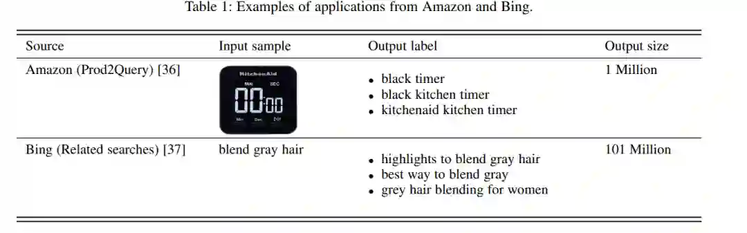 在亚马逊的产品搜索[38]和阿里巴巴的零售[39]中,每个产品都被视为一个标签,用户可能想从大量的候选集合中为用户推荐他们可能喜欢的产品列表。在这种设置下,收集用户信息作为输入特征,并利用其购物历史构建观察标签。很容易看出,这个问题可以表述为一个多标签学习任务。由于平台上的产品和用户数量巨大,对训练和推理速度的要求非常高。此外,推荐要个性化,学习到的模型不偏向热门产品,很少推荐稀有产品。这对推荐系统中的XML提出了挑战。