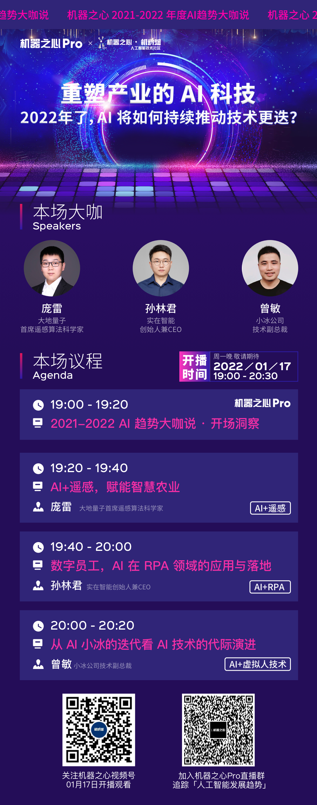 作为「与 AI 俱进,化时光为翎」机器之心 2021-2022 跨年特别策划中的重要组成部分,「机器之心 2021-2022 年度 AI 趋势大咖说」聚焦「驱动未来的 AI 技术」与「重塑产业的 AI 科技」,推出线上分享,邀请行业精英、读者、观众共同,回顾 2021 年中的重要技术和学术热点,盘点 AI 产业的年度研究方向以及重大科技突破,展望 2022 年度 AI 技术发展方向、AI 技术与产业科技融合趋势。 本次线上分享会为期两周,分为两个主题周,第一周主题为「重塑产业的 AI 科技」,将于 2022 年 1 月 17 日——2022 年 1 月 21 日期间分为五期进行,来自博世中国、小冰公司、大地量子、实在智能、天壤智能、来也科技、亮亮视野等近 20 家企业的大咖嘉宾将分别做客「机器之心 2021-2022 年度 AI 趋势大咖说」直播间,围绕「技术升级」、「产业革新」两大方向,「企业 IT」、「AI for Science」、「智能驾驶与出行」等三大人工智能重点应用产业的发展趋势,尽可能的呈现 AI 未来的发展脉络。
