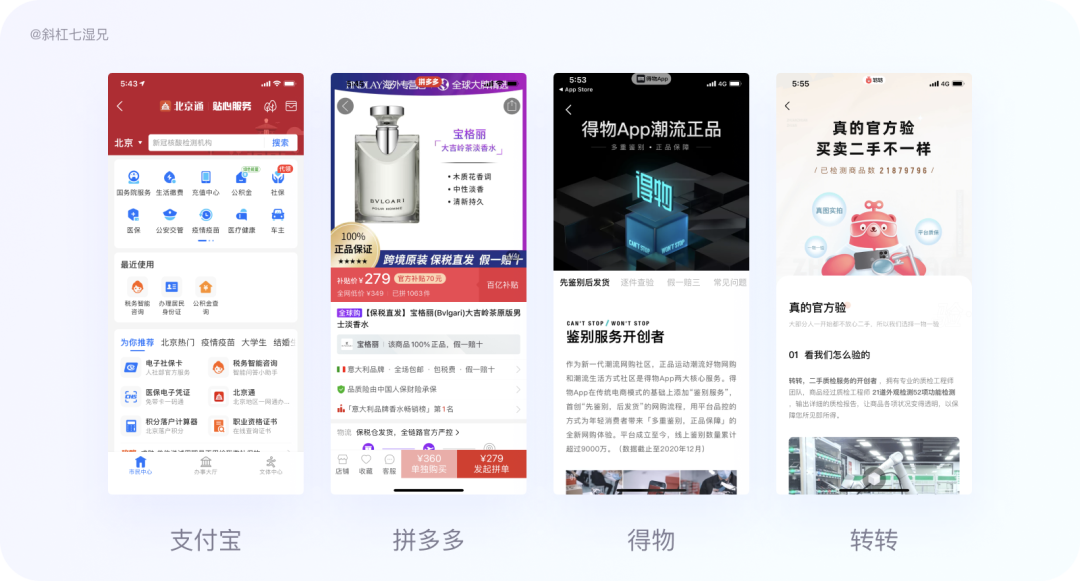 我举几个例子,比如支付宝产品就会以政府做信任背书,比如拼多多、得物、二手转转等电商交易平台会借助权威的机构来和用户建立起信任关系。