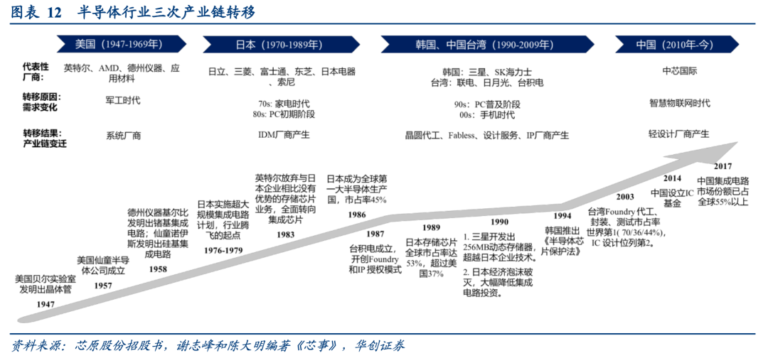 行业观点认为,全球半导体产业链重心经过从美国到日本(20世纪70-80年代)、日本到韩国和中国台湾(20世纪90-21世纪初)两次迁移后,如今正逐渐向中国大陆转移,尤其是IC制造环节。一方面在于,韩国和中国台湾逐渐失去劳动力成本的优势;另一方面,中国大陆的晶圆厂及产能正处于高速扩张阶段,将进一步刺激半导体材料市场需求的增长。