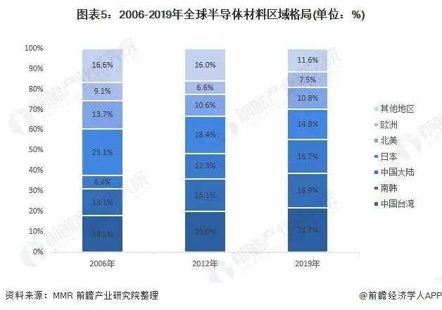 值得注意的是,得益于半导体国产替代意识提高对IC产业规模的进一步拉升,全球半导体材料市场的重心正逐渐向亚洲转移。据Maximize Market Research数据,若以区域划分,从2006-2019年,中国台湾的半导体材料市场份额从18.1%增长至21.7%,韩国从13.1%增长至16.94%,中国大陆则从6.4%提升至16.67%,而日本、北美、欧洲等国家及地区的市场份额逐渐下滑。