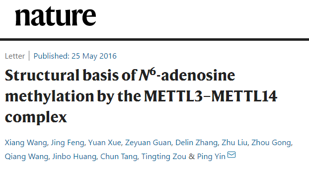 2016年5月26日,殷平团队在国际顶级学术期刊Nature在线发表了题为“Structural basis of N6-adenosine methylation by the METTL3-METTL14 complex”的研究论文,报道了关于N6腺嘌呤甲基转移酶的最新科研进展,首次报道了METTL3-METTL14蛋白复合体晶体结构,取得了表观遗传学的一项突破,这也是华中农业大学自建校以来首篇登上Nature的研究论文。