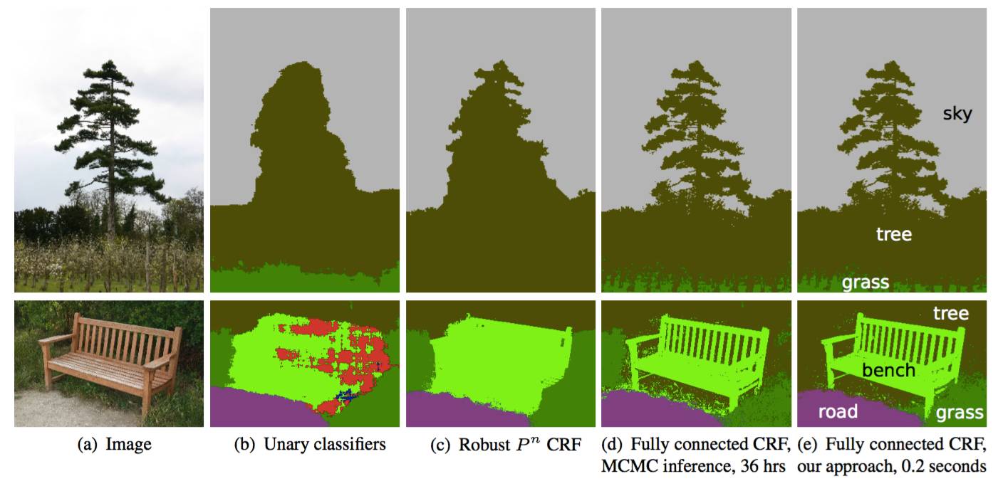 CRF 示意图。(b)一元分类器作为 CRF 的分割输入。(c、d、e)是 CRF 的变体,其中(e)是广泛使用的一种 CRF
