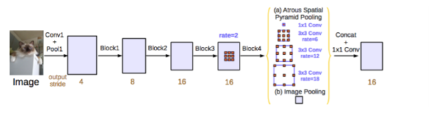 与 DeepLabv2 和空洞卷积论文一样,该研究也使用空洞/扩张卷积来改进 ResNet 模型。改进后的 ASPP 包括图像层级特征连接、一个 1x1 的卷积和三个 3x3 的不同比率空洞卷积。每一个并行卷积层之后使用批量归一化操作。