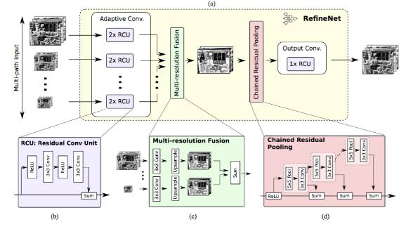 每一个 RefineNet 模块都有两个组件,一个组件通过对低分辨率特征进行上采样来融合多分辨率特征,另一个组件基于步幅为 1、5 x 5 大小的重复池化层来获取背景信息。这些组件遵循单位映射的思想,采用残差连接设计。