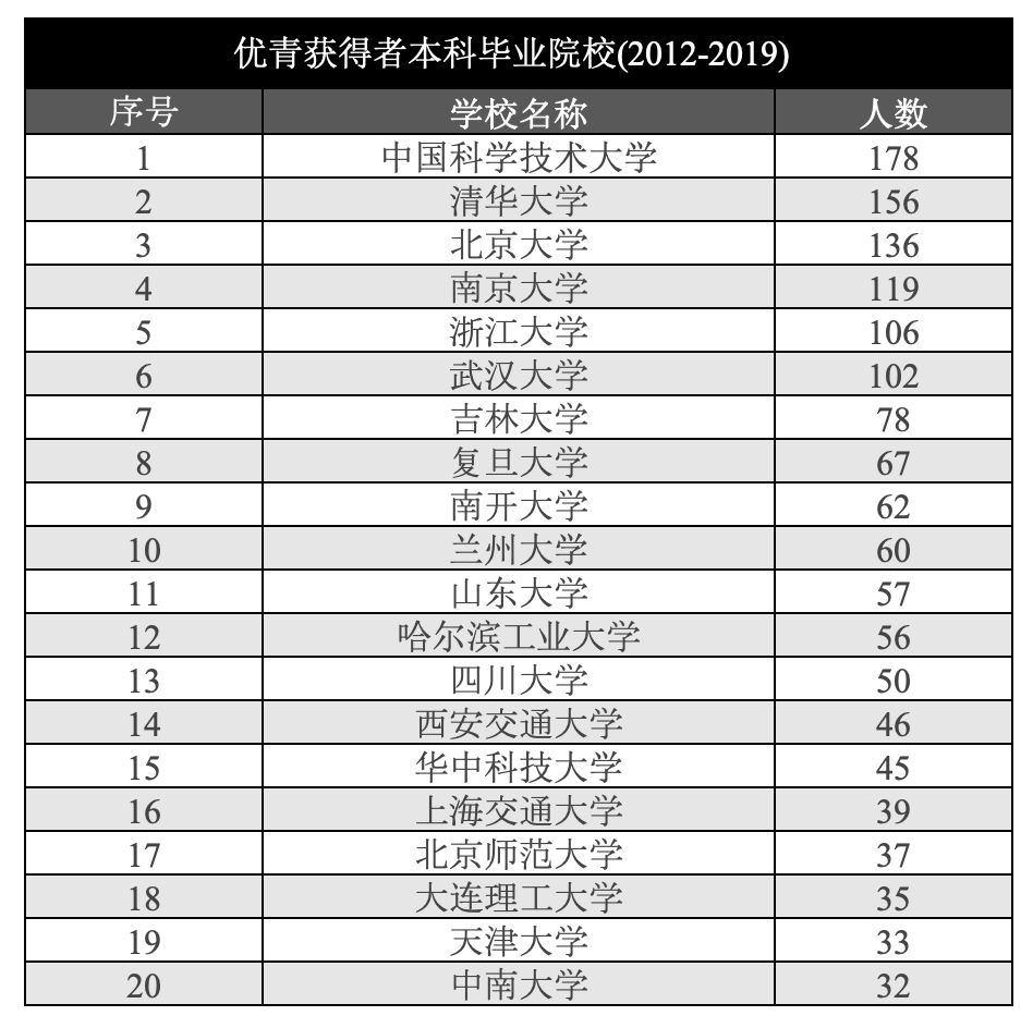 从数据不难看出,优青本科毕业于中国科学技术大学的人数遥遥领先于其他院校,为178人。