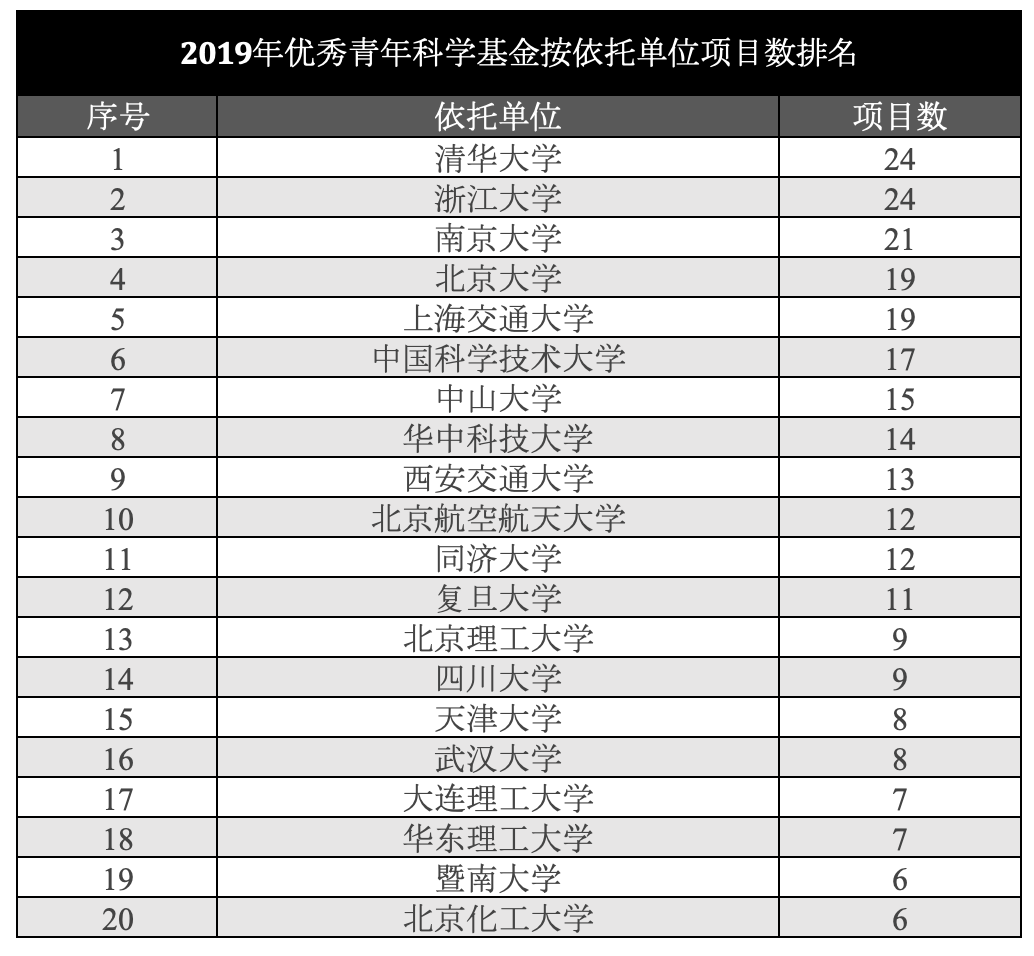 △2019年优秀青年科学基金按依托单位项目数排名(不包含港澳地区),数据来源:科塔学术