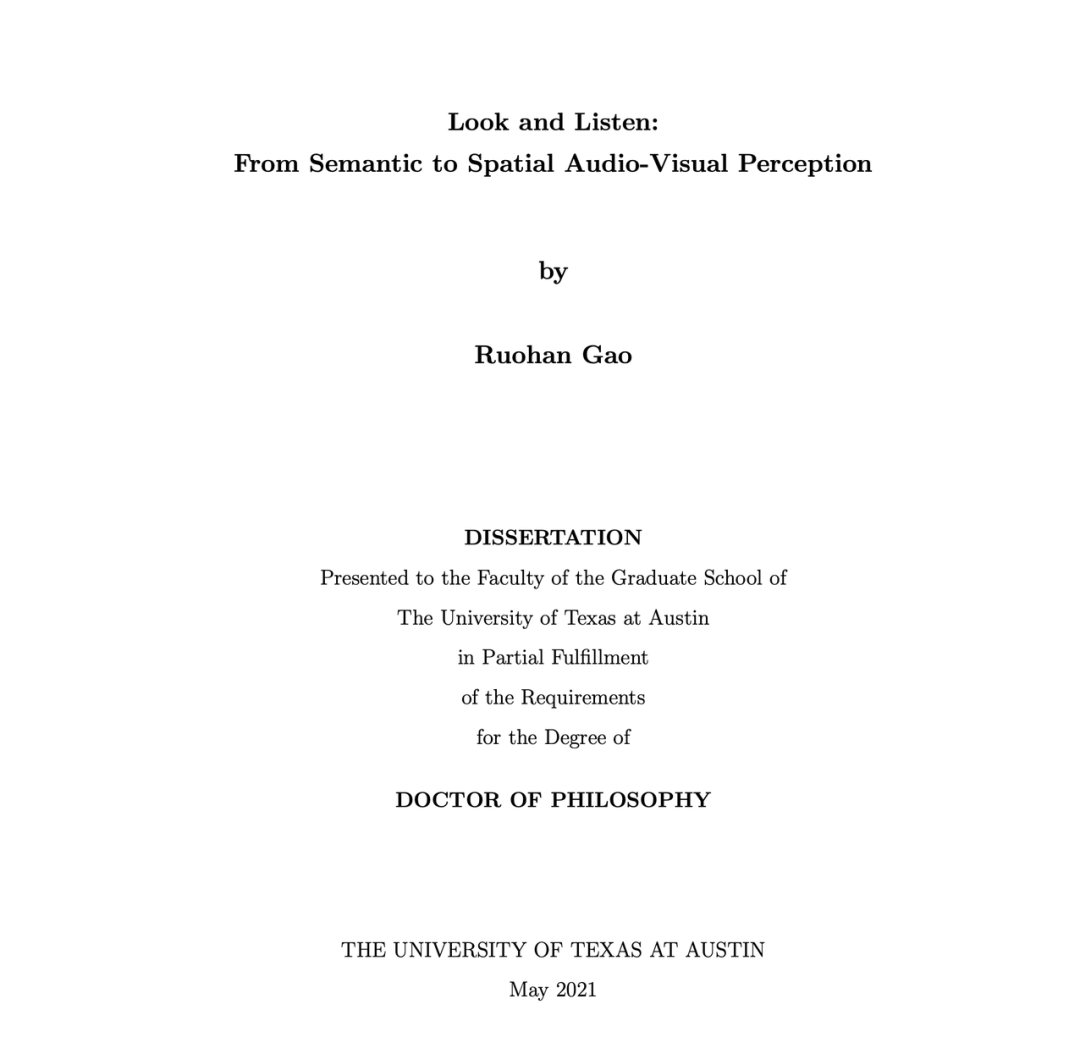 在本年度的评选中,华人学者 Ruohan Gao 的博士学位论文《Look and Listen: From Semantic to Spatial Audio-Visual Perception》获得了 Michael H. Granof 奖。