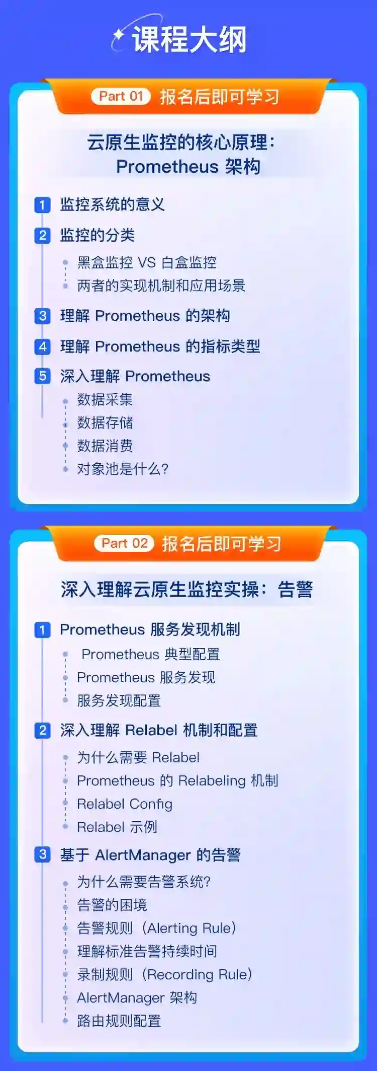 2节视频课,8大内容要点,包括以 Prometheus 为核心的监控系统的架构设计以及如何实现有效告警。在建立对监控体系的整体认知基础上进一步实操,对企业级的应用做到心中有数。