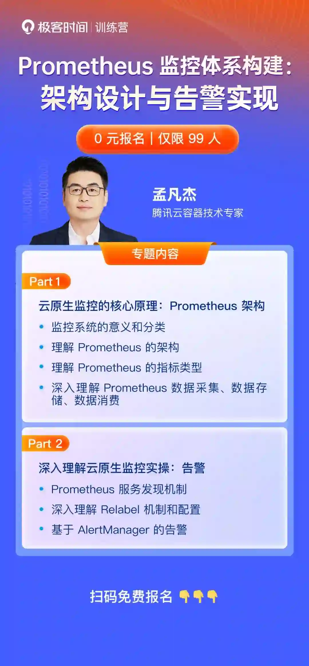 今天给你推荐一个监控方面的优质专题,Prometheus 监控体系构建:架构设计与告警实现,腾讯技术专家孟凡杰的分享,原理+实操,帮你扫清监控方面的障碍,掌握可复制的解决方案。