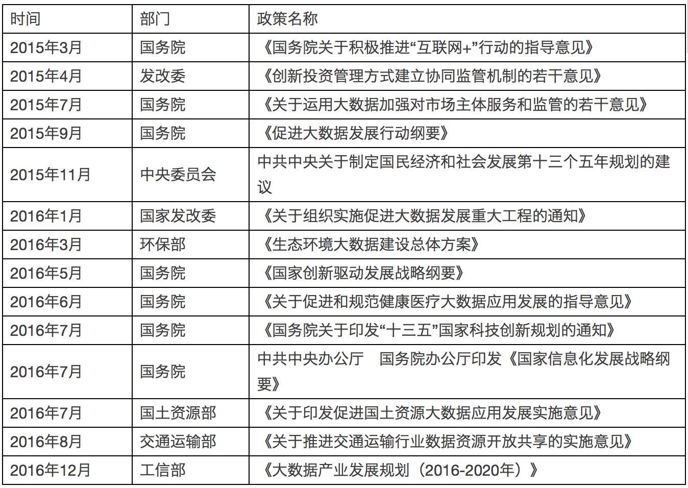 据不完全统计,从2014年至今我国涉及到大数据发展与应用的国家政策规定已多达63个,其中国家大数据发展顶层设计1个,国家层面顶层规划4个,重点行业领域发展应用31个,重点工作推进25个,重点区域发展2个。大数据战略已上升为国家战略高度,各部委从战略规划、技术能力提升、应用与管理三个层面积极落实推进大数据发展政策。