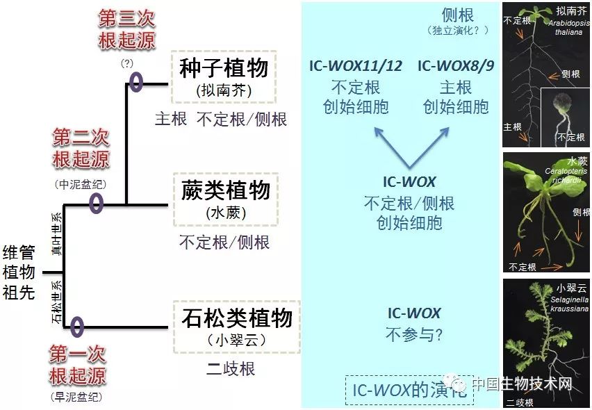 最近一系列对IC-WOX基因(intermediate-clade WOX genes)的研究结果暗示,IC-WOX基因的演化与根的第二和第三次起源同步发生,可能是真叶世系中根起源的重要分子机制。IC-WOX基因是维管植物特有的基因,它们在石松世系和真叶世系分开之前的共同祖先中就已出现。在石松世系的现存植物小翠云(Selaginellakraussiana)中,IC-WOX基因并不特异表达在根发育进程中,因此石松世系可能并不利用IC-WOX基因特异参与二歧根发育。在真叶世系的现存蕨类植物水蕨(Ceratopterisrichardii)中,IC-WOX基因特异表达在不定根和侧根的根创始细胞(root founder cell)中,起始根的发育。在真叶世系的现存种子植物拟南芥(Arabidopsis thaliana)中,IC-WOX基因发展成了两个进化亚枝:IC-WOX11/12亚枝特异表达在不定根创始细胞中,起始不定根的发育;IC-WOX8/9亚枝特异表达在胚胎的主根创始细胞中,起始主根的发育。