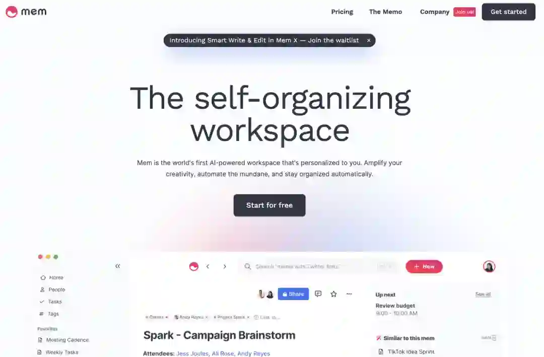 接着让我们到产品官网看一看,打开get.mem.ai官网后,首先印入眼帘的就是产品定位:Self-organizing workspace,下面一行小字详细解释了Mem是世界上第一个具有AI能力的工作台,提供个性化的内容给到用户,帮助用户更好的挖掘和使用这些信息。