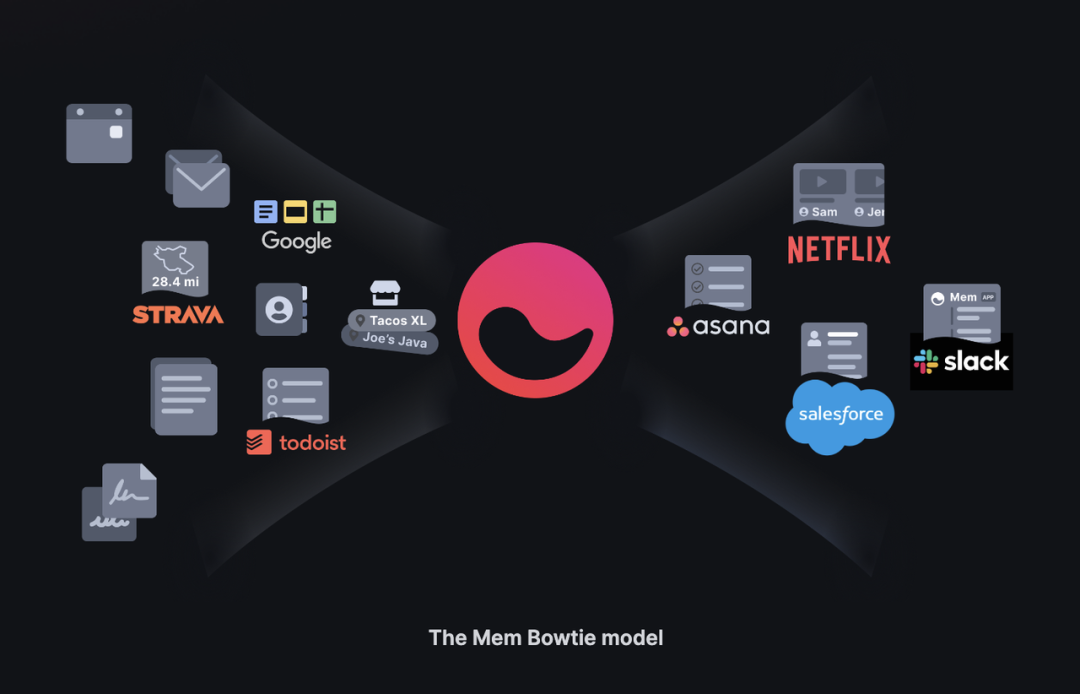 下图就是Mem定义的Bowtie(蝴蝶结)模型示意图,左侧是信息数据的来源,比如Google全家桶、Todoist等等,用户可以通过API接口将这些数据同步到Mem上,然后Mem会通过AI的能力将这些非结构化的数据连接起来,变成有意义的结构化数据,并形成用户自己的知识图谱。