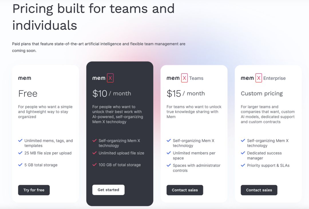 接着来看看产品定价和套餐,Mem采用了Freemium(免费增值)的定价模式,总共有四个套餐: