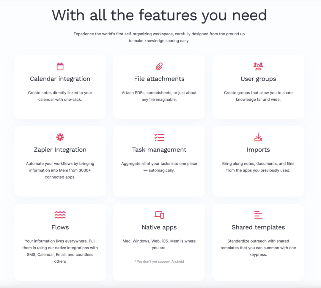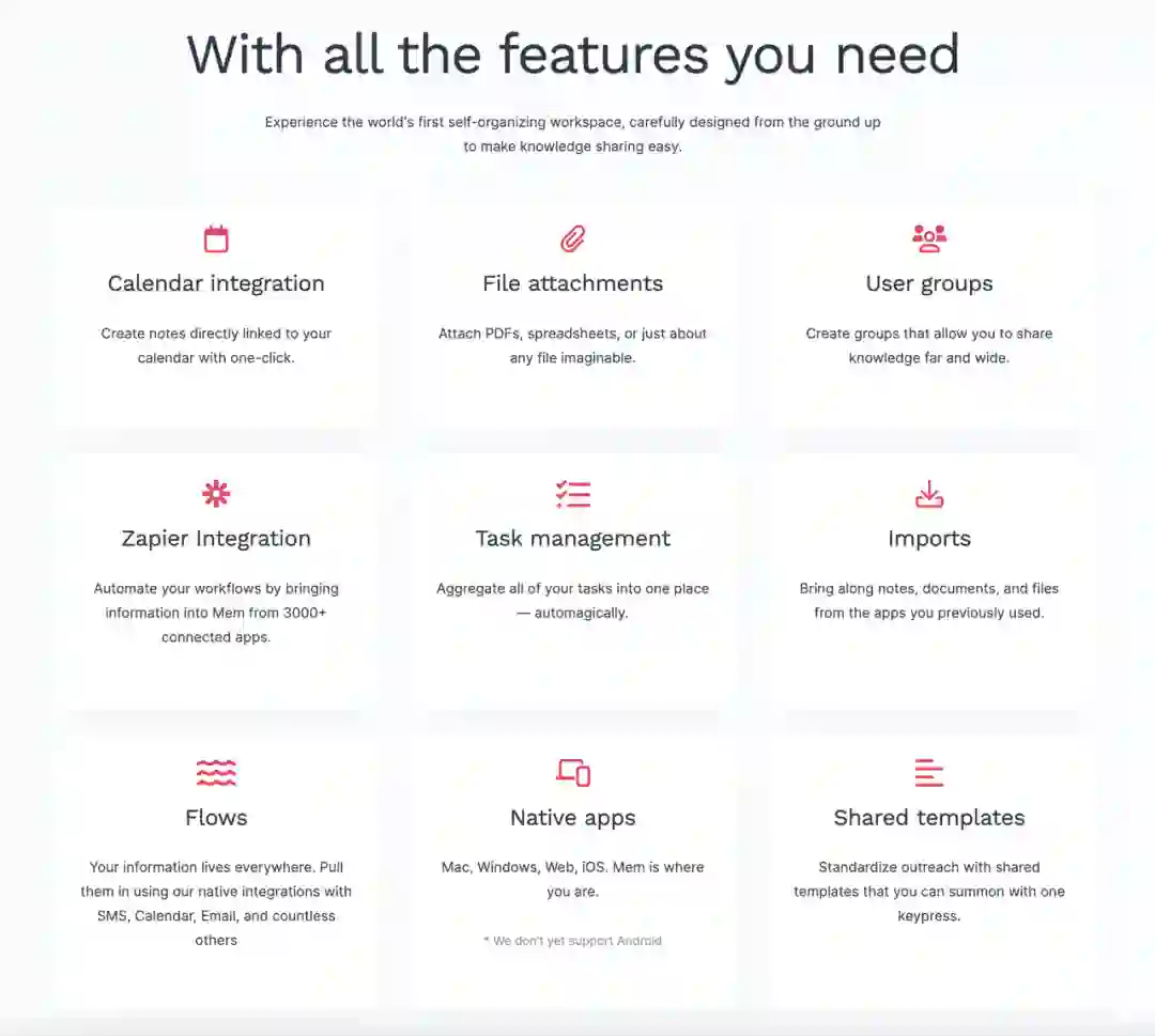 紧接着的一个板块是Mem的功能特性列表,里面主要包括了9大核心功能,方便用户更全面的了解Mem。