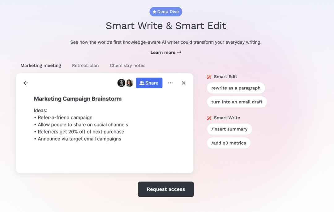 Mem官方提供了Marketing meeting、Retreat plan和Chemistry notes这三种文本样例,并且用户可以轻松点击右侧的功能选项,来快速体验对应功能的结果,帮助用户感受到产品价值。更多具体介绍可以看下方这个视频: