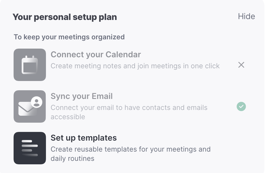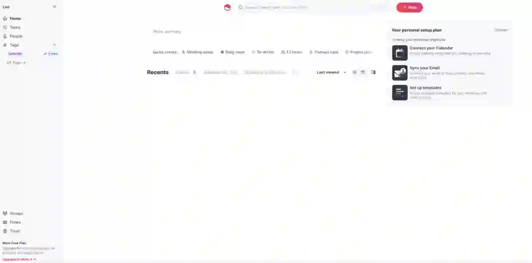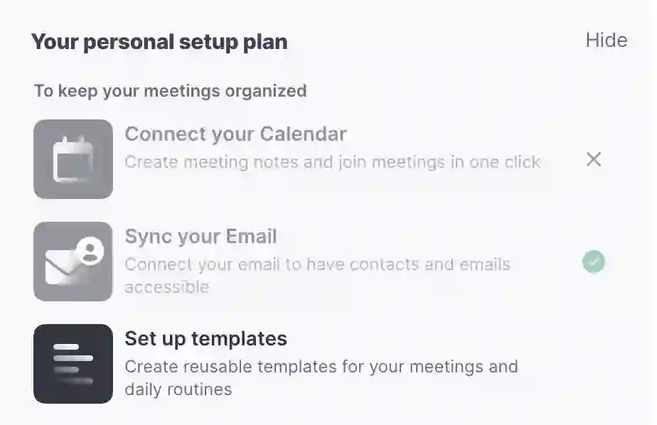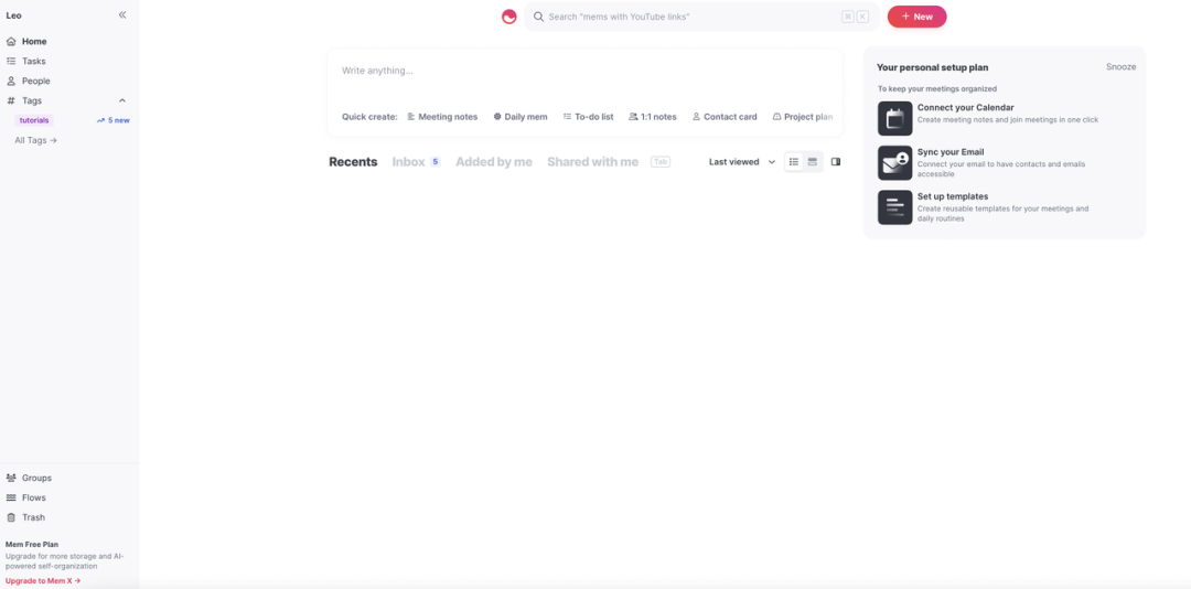 对于首次登录的用户,在最右侧还会有Setup初始化设置的引导提示,分别是连接日历、同步邮件和设置模版,帮助用户快速上手Mem的核心功能,并从中导入更多内容到Mem。