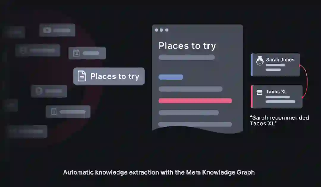 Mem会通过AI将这些不同节点上的Entity进行分析和连接,比如你在一条笔记中提到了某位朋友推荐的一家餐馆,这两个信息点都会在知识图谱中进行分析和归类,并自动形成关联,当外部条件触发时,这些信息就会自动呈现在用户的面前。