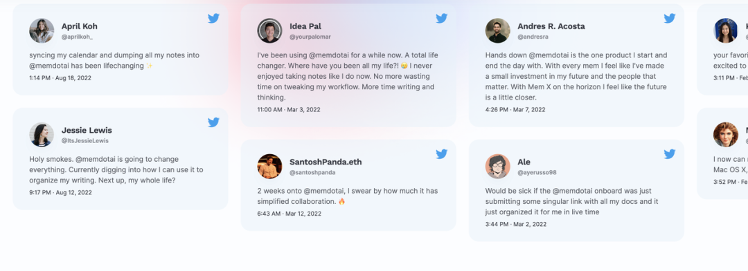 最后一个板块就是常规的用户评价,不过Mem直接引用了用户Twitter上的推文作为评价,点击之后就可以跳转到对应的推文,更加具有真实性,增强用户信任。
