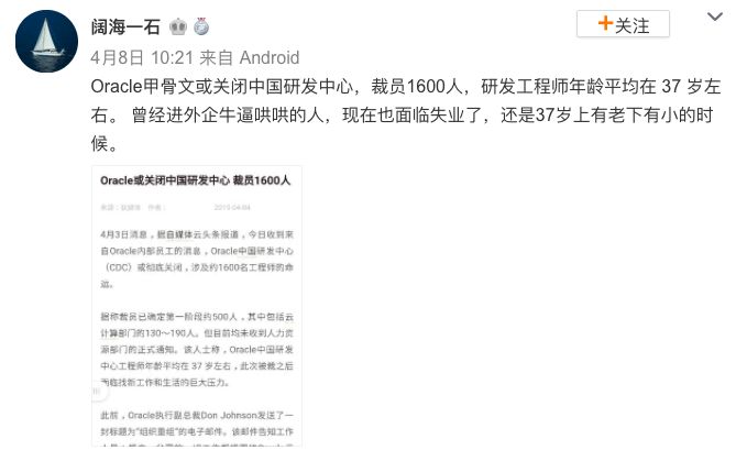 再看看如今甲骨文中国被裁员工们平均37岁的年龄,确实会更加的窘迫和尴尬。