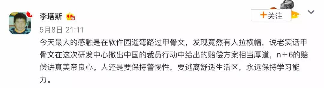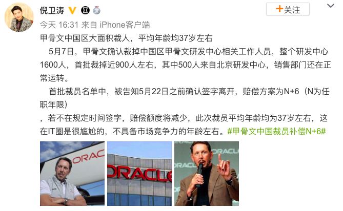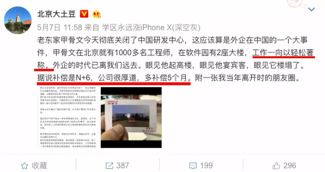 微博上知名的房产博主@北京大土豆就曾是甲骨文中国的前员工,他说自己当初不走,就能拿14个月的补偿,以此N+6的方案来推算,他可能在甲骨文中国工作了8年之久。