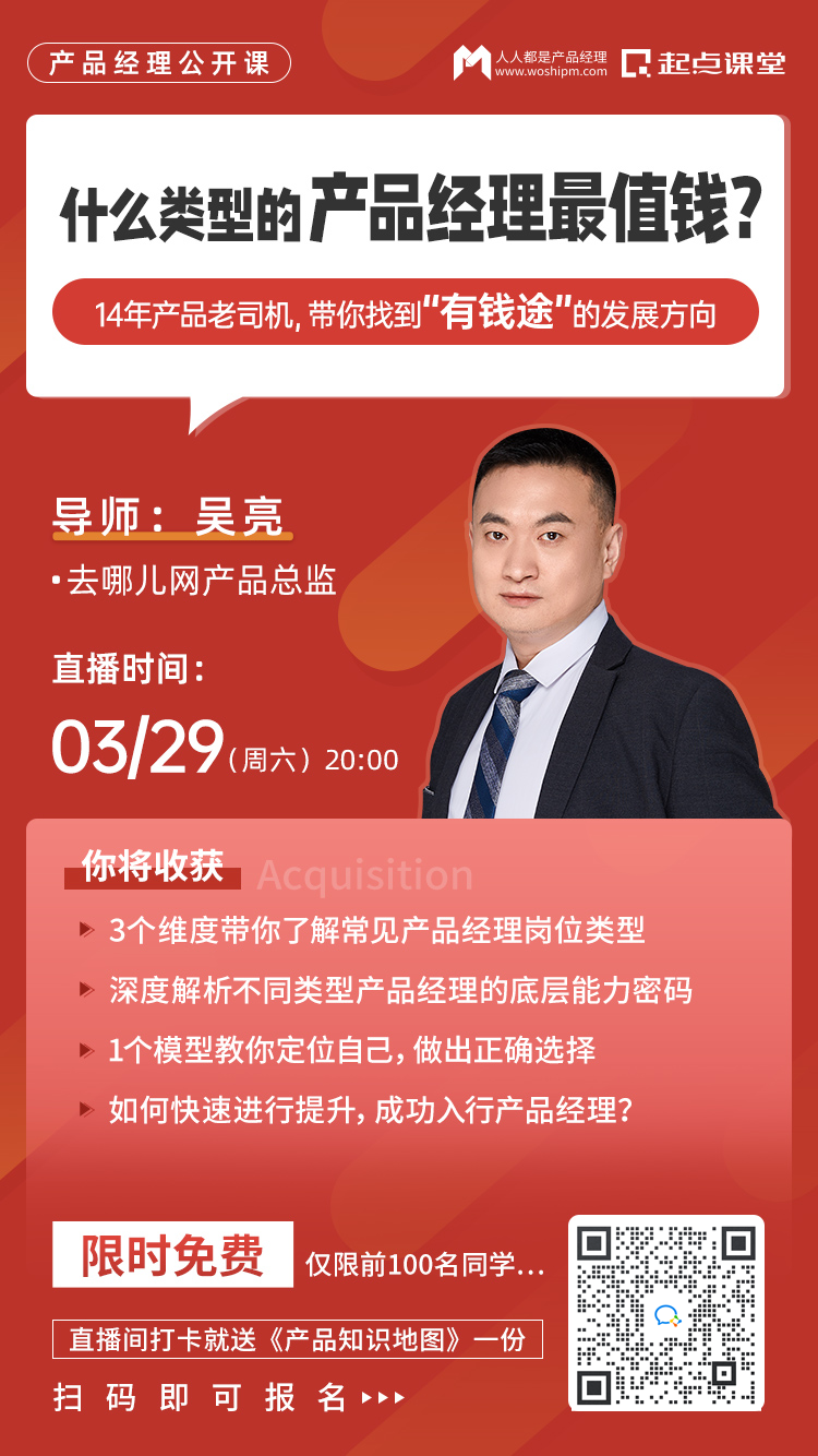 3月29日(周二)晚上20点,我们邀请了深耕互联网领域14年、前去哪儿网产品总监@吴亮老师,综合其在百度、去哪儿网等知名互联网公司产品团队管理经验,以及创业经验。