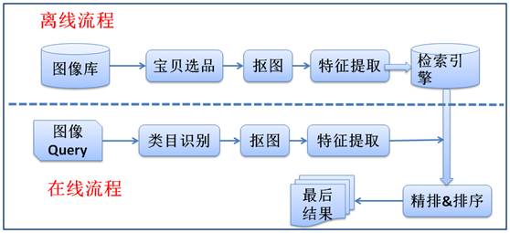 离线流程:主要是指拍立淘每天离线构建索引库的整个流程,涉及选品、离线抠图、离线抽取特征、构建索引等环节。执行完毕之后,每天会在规定时间完成线上图库的更新。