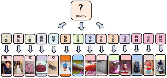 另外,在类目识别方面,为了进一步提高分类精度,我们采用层次化的类目识别: