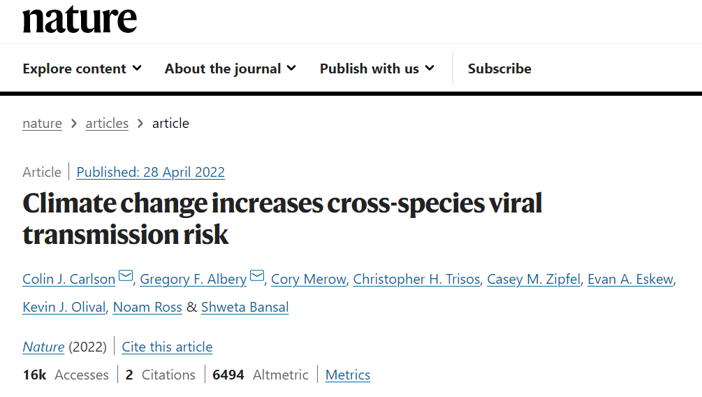 科学家们还指出,气候驱动的物种扩散和病毒进化可能已经在发生中。这些转变可能导致了埃博拉病毒、冠状病毒或其他新病毒的出现,并使得新病毒更难被追踪,也使得病毒更容易跨越“垫脚石”物种进入人类,即病原体从野生动物传播到人类。