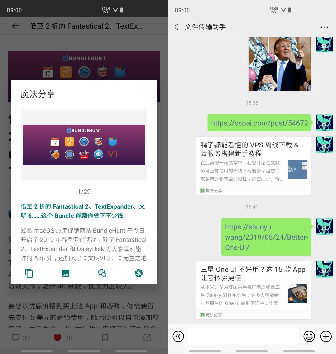 对于未适配的 App,将链接分享至微信后只有孤零零的一串文本,而且无法直接发布到朋友圈。魔法分享则可以充当 App 与微信间的中转站,为任意网页生成缩略图和标题,与微信朋友聊天时更方便。此外,魔法分享还会留存你的历史分享记录,可以在 App 内统一管理,相当于一个简化版的稍后阅读工具。