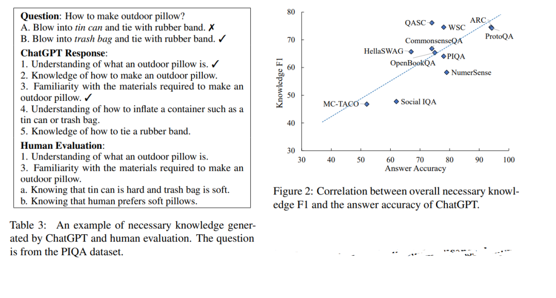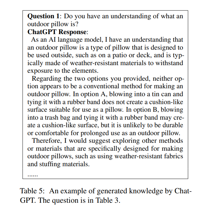 本节回答了这个问题:大型语言模型在多大程度上具有常识知识?为了回答这个问题,类似于Shwartz et al.(2020),我们根据第3节中生成的必要知识手动构建知识查询提示。例如,如表5所示,基于表3中的知识1,我们将问题写成“你对什么是户外枕头有了解吗?”我们将这些提示输入到ChatGPT中,并手动标注ChatGPT生成的每一个知识描述是否正确。