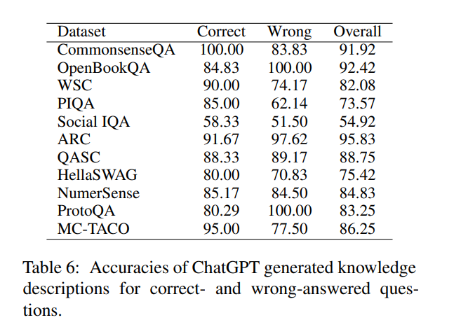 GPTs知识渊博,包含了准确回答问题所需的大部分常识知识。通过提出知识-查询问题和手动评估ChatGPT的响应,我们评估了ChatGPT中必要知识的准确性。表6的结果显示,ChatGPT生成的知识描述在大多数常识性QA数据集上都能达到70%以上的准确率,达到82.66%的平均准确率。这表明,在给定知识查询问题的情况下,ChatGPT可以生成准确的常识知识描述。这表明llm可以作为常识知识库,并为下游任务提供常识。然而,在社会领域的准确率较低,为54.92%。我们认为,这是因为社会常识,如“接受帮助的人,而不是给予帮助的人,应该说谢谢”,在文本中并不常见。这就突出了开发具体指导的重要性,可以指导ChatGPT获取社会常识知识。