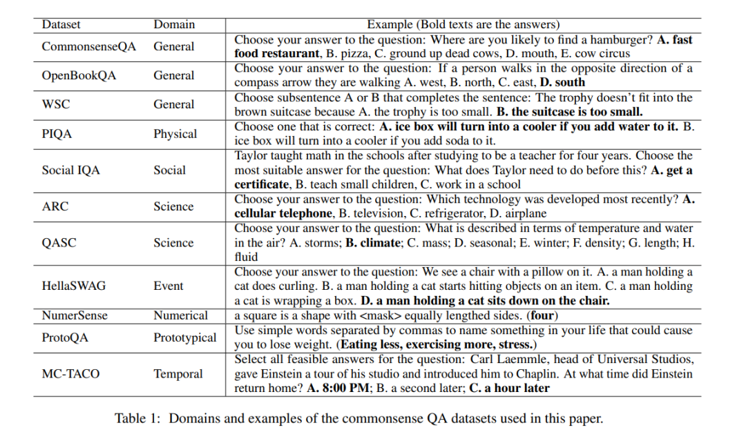 在这一节中,我们评估了LLM回答常识问题的表现。具体来说,我们使用了11个常识QA数据集,涵盖了8个常识领域,包括通用、物理、社会、科学、事件、数值、原型和时间。这11个数据集是common - monsenseQA (Talmor等人,2019)、OpenBookQA (Mihaylov等人,2018)、WSC (Levesque等人,2012)、PIQA (Bisk等人,2020)、Social IQA (Sap等人,2019)、ARC (Clark等人,2018)、QASC (Khot等人,2020)、HellaSWAG (Zellers等人,2019)、NumerSense (Lin等人,2020)、ProtoQA (Boratko等人,2020)和MC-TACO (Zhou等人,2019)。数据集及其域,每个数据集都有一个示例,如表1所示。