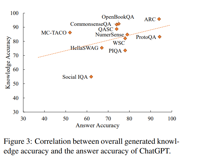 通过增强GPTs的知识意识(knowledge-awareness),即引导模型识别特定问题所需的知识,可以显著提高GPTs的常识能力。在图2中,我们绘制并分析了生成的必要知识的总体F1分数与答案之间的相关性ChatGPT的准确率。结果显示准确率和知识F1有很强的相关性,皮尔逊系数为0.77。此外,表4显示,正确回答问题的知识F1得分明显高于错误回答问题的知识F1得分。这些发现表明,准确识别必要的知识对于正确回答常识问题至关重要。因此,增强模型对必要知识的自我意识,有可能提高其在包括常识QA在内的下游任务上的性能。