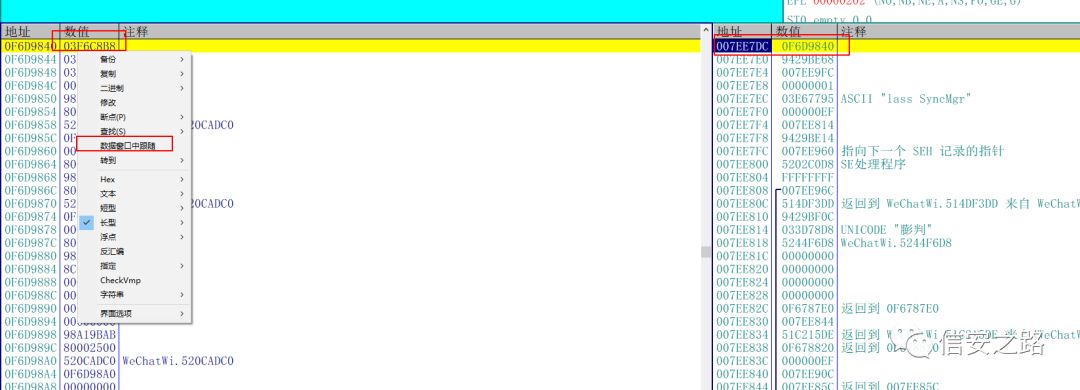 接着载入 OD,在找到的当前窗口 ID 的地址中下一个内存访问断点。为什么是内存访问断点而不是内存写入呢?因为当前微信窗口的 ID 肯定会被发送消息的当作参数传入到堆栈中,所以必定会访问这个 ID,而不是写入 ID。