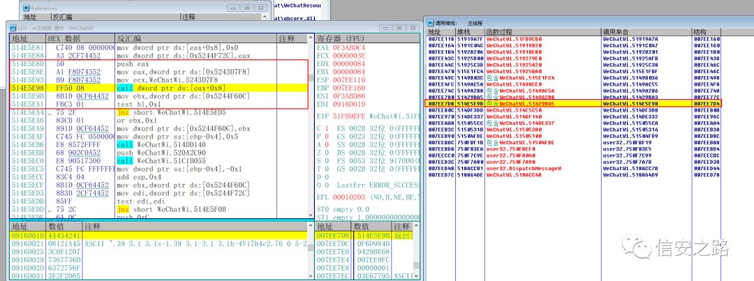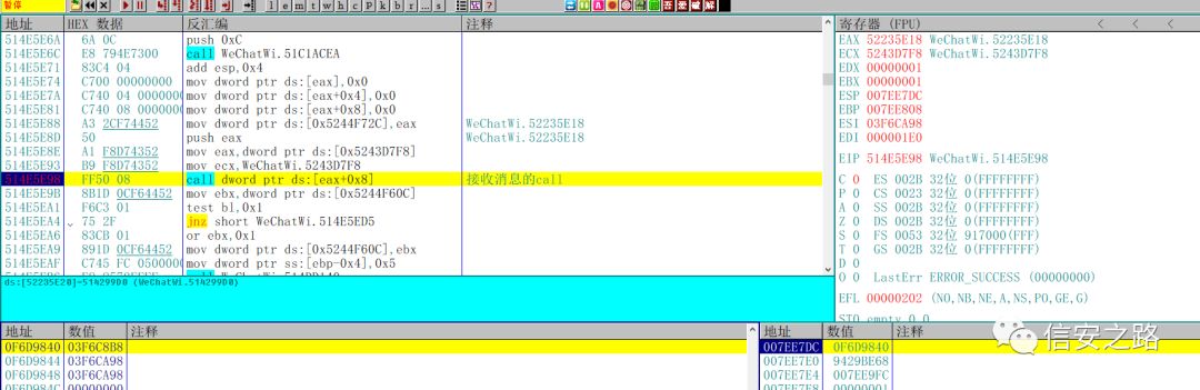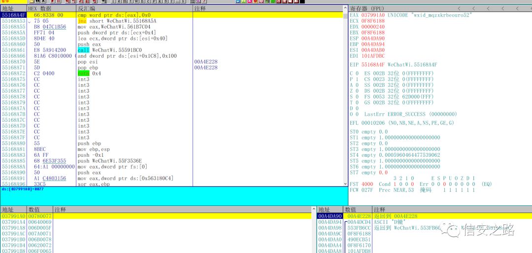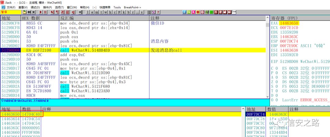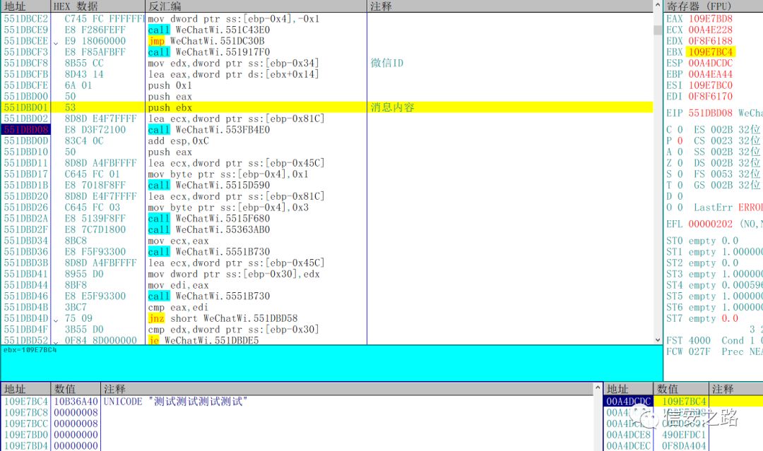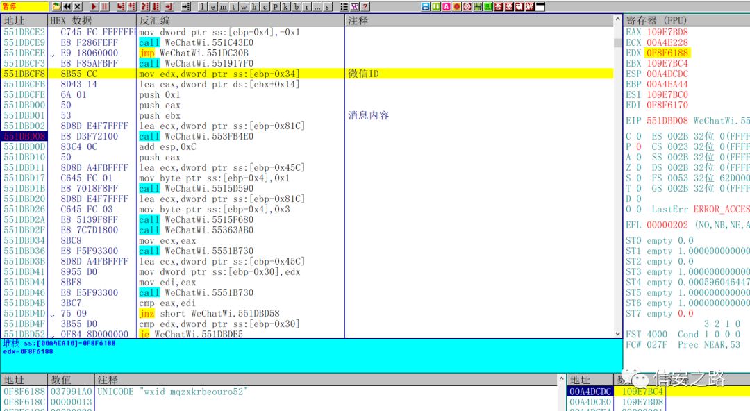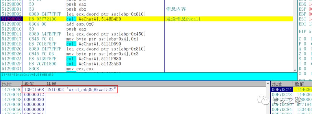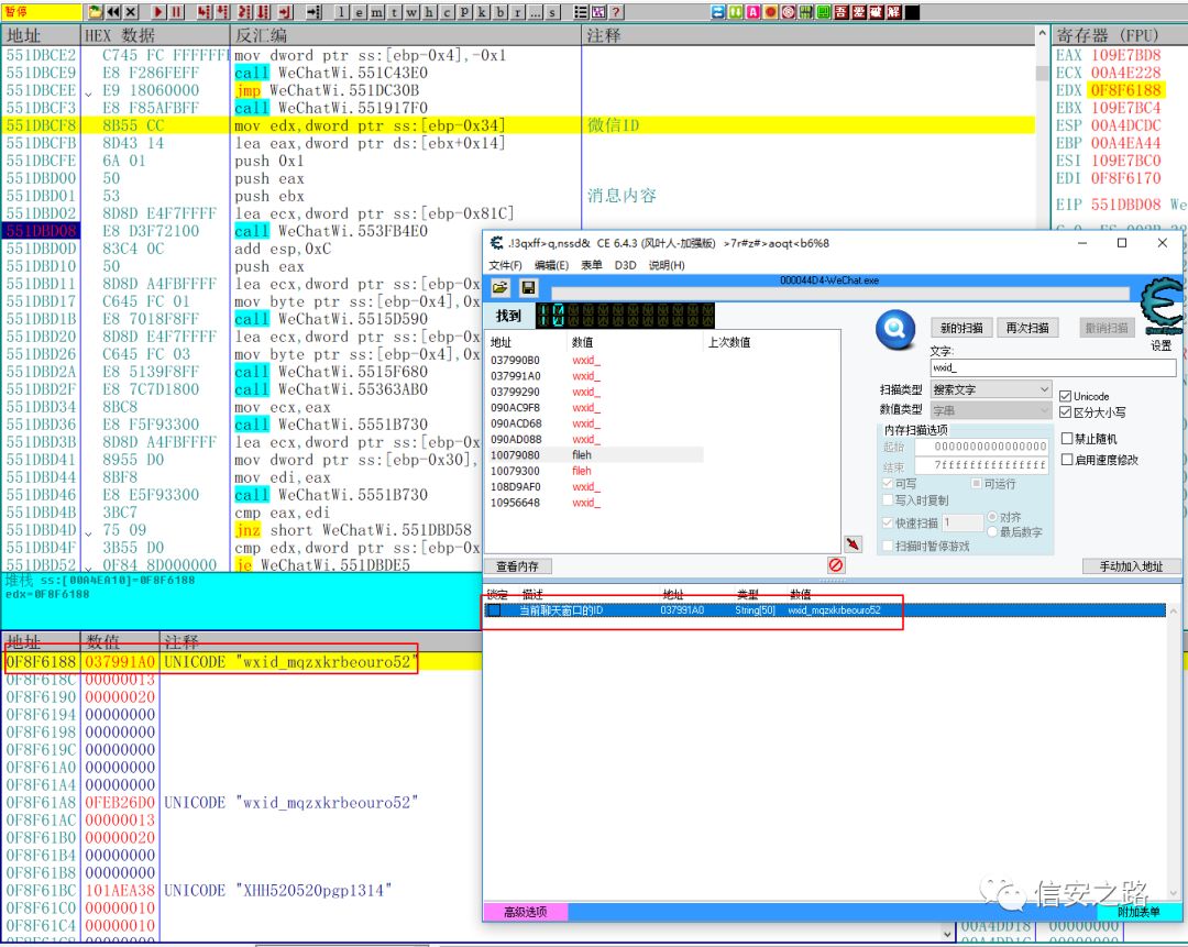 找到了发送消息的函数,那么怎么验证呢?利用微信 ID。将 edx 指向的微信 ID 的地址和我们之前在 CE 中找到的当前窗口的微信 ID 对比,你会发现两个地址是一样的。