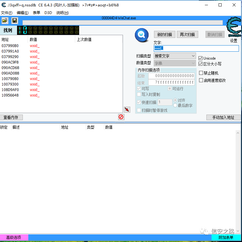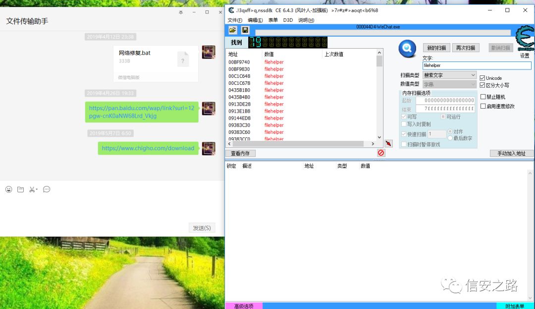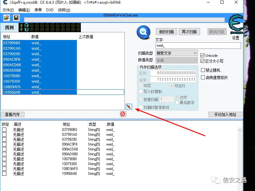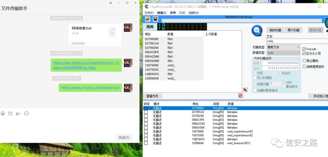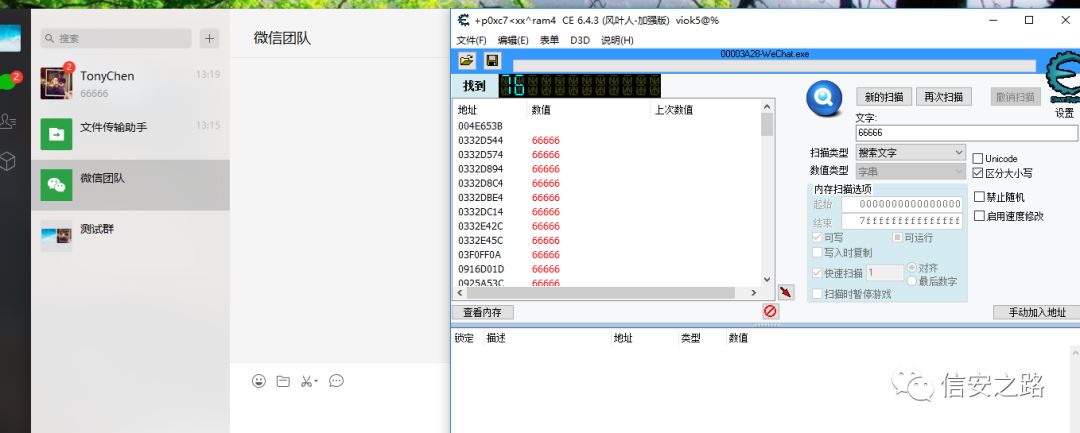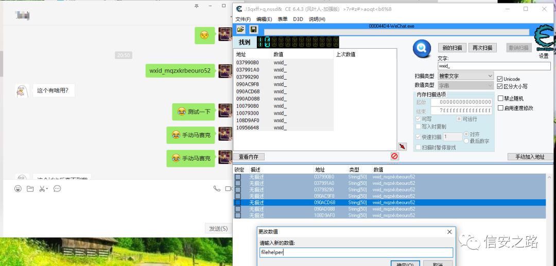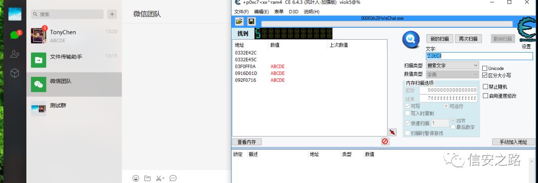 首先用另外一个微信给自己发一条消息,在不点开消息的状态下用 CE 搜索消息内容