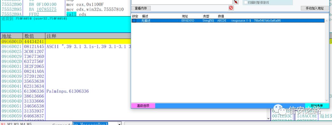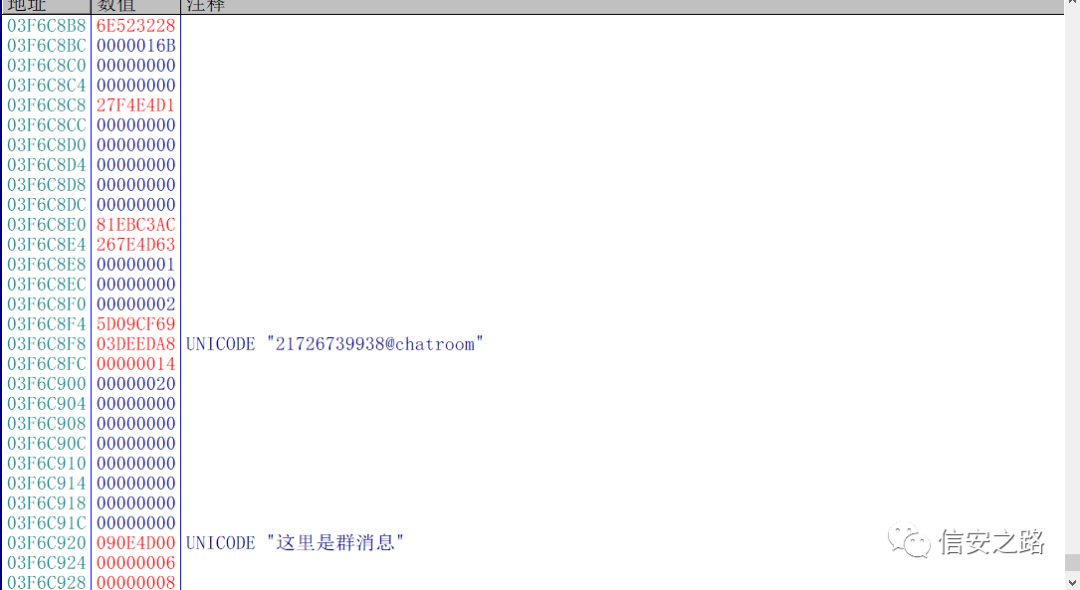与接收消息函数最直接相关的东西肯定是消息本身,所以消息本身的内容就是我们的切入点。我们可以首先找到存放消息内容的地址,然后对地址下断,通过栈回溯最终定位到接收消息的函数