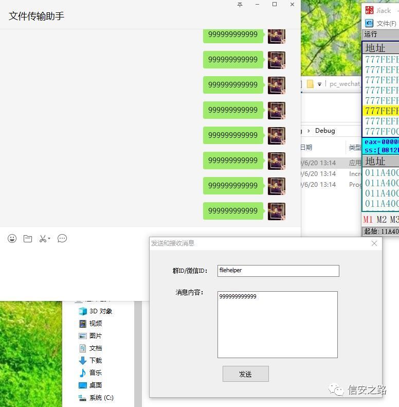 接下来我们只要记录下当前发送消息函数的地址+偏移,就能写一个 dll 注入到微信进程空间中,直接调用发送消息的函数,就能实现用自己写的程序给任何人发送消息。