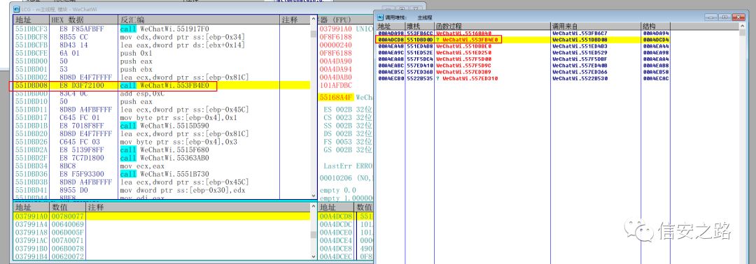 在拿到接收者的微信 ID 之后,对这个地址下内存访问断点,然后通过栈回溯的方式就能找到发送消息的 call