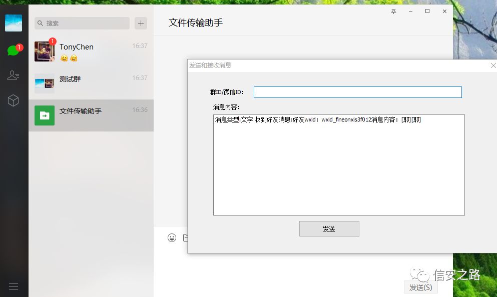 选中一半地址,将其更改为 filehelper,然后在当前窗口发送消息。如果消息发给了 filehelper,那么选中的地址里面就有真正的当前聊天窗口的 ID。重复这个步骤,可以找到真正的当前窗口 ID