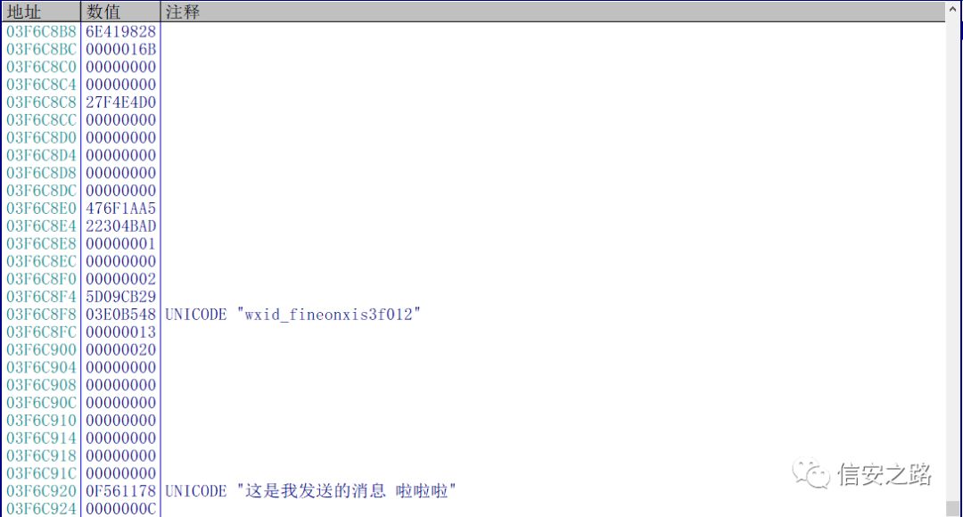 里面的被艾特的人的微信 ID,普通消息与艾特消息的区别就在于 eax 是否保存了被艾特人的微信 ID。大家可以用同样的方式分析处图片和表情在内存中的表现形式。