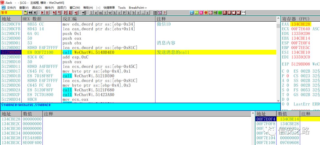 改变这个地址的微信 ID 和内容,就能直接改变消息的接收者和内容,这个刚才我们已经实验过了。再结合这个函数传入的参数有当前消息的内容,就可以确定这个 call 就是微信发送消息的函数。