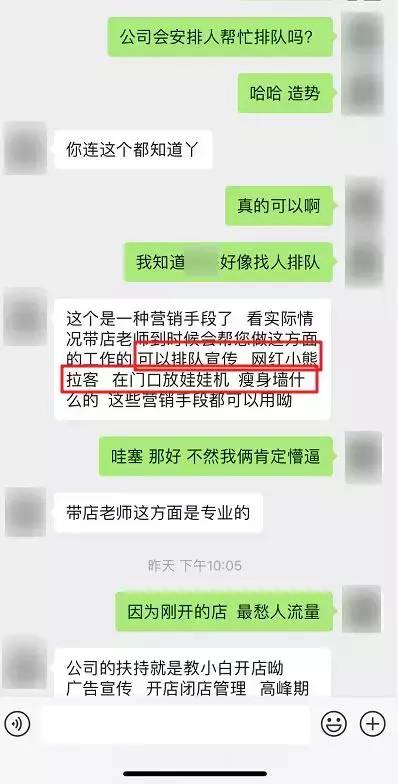 他说不仅会有人帮忙排队,还会用网红小熊拉客、门口放娃娃机、瘦身墙等。然后催我赶紧去实地考察,不然那被别人抢先就享受不到这样的服务了……